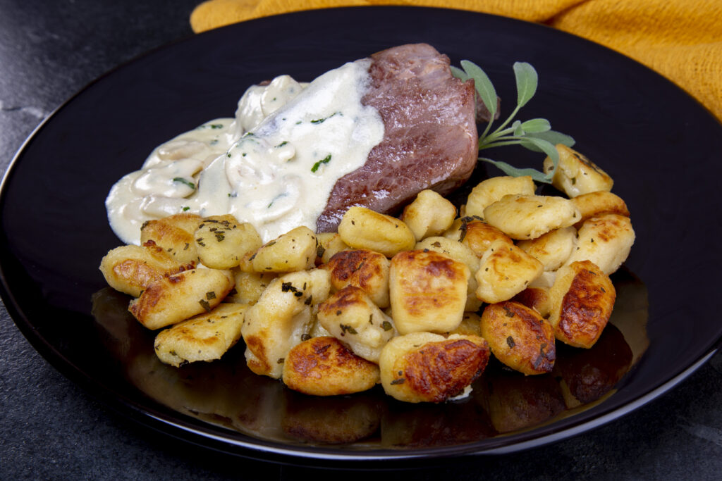 Suculento baby beef grelhado ao molho branco de cogumelo paris e queijo com nhoque de batata dourado na manteiga de sálvia.