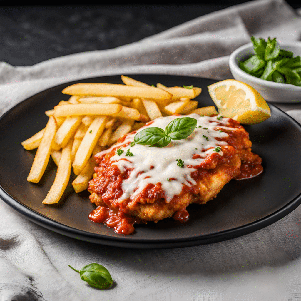 Tradicional filet de frango à milanesa, molho bechamel e talharim ao alho e óleo.